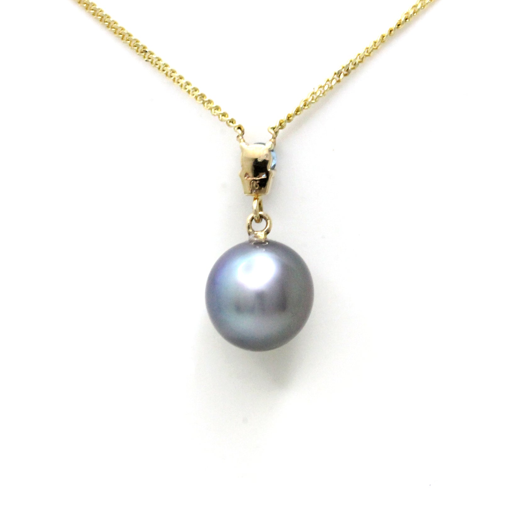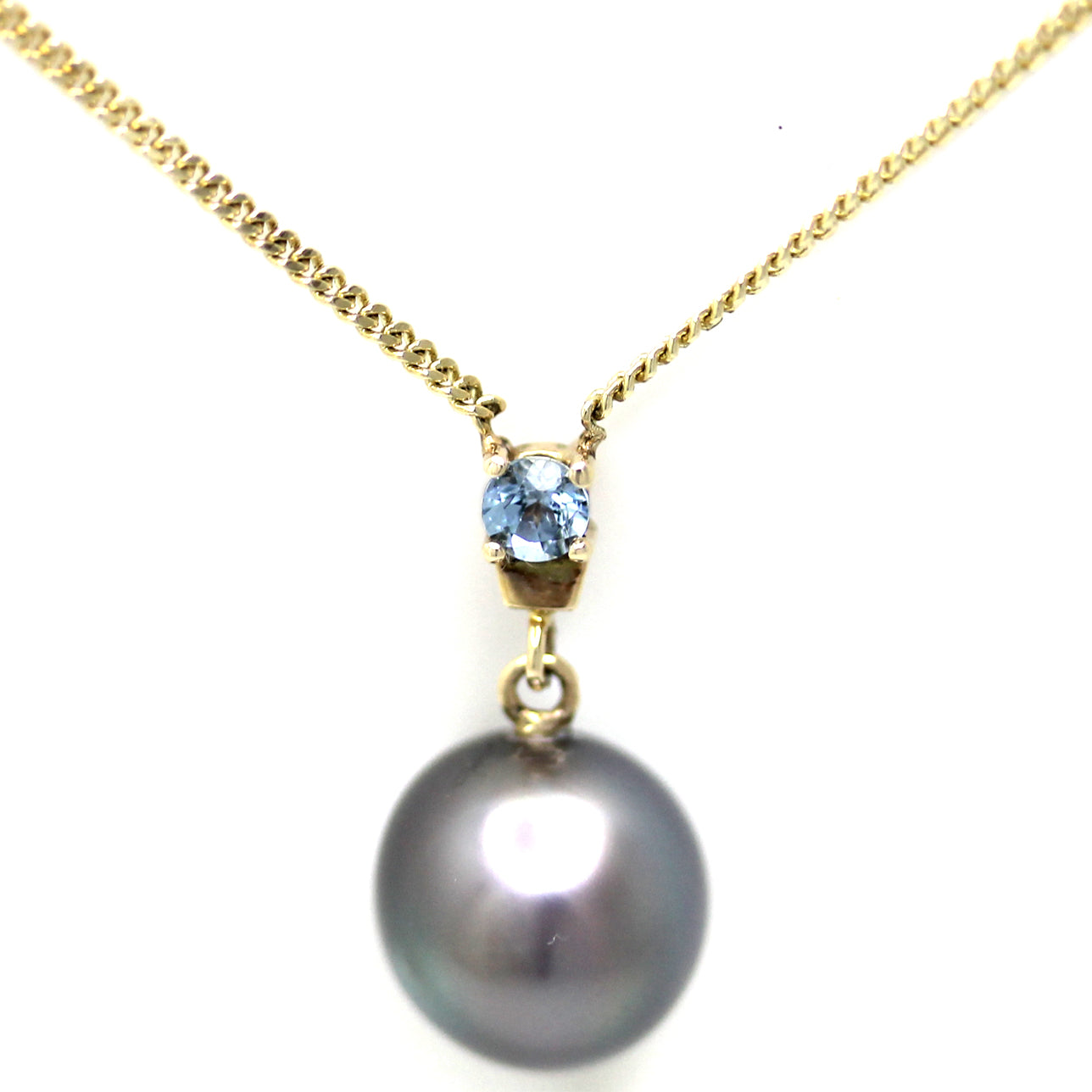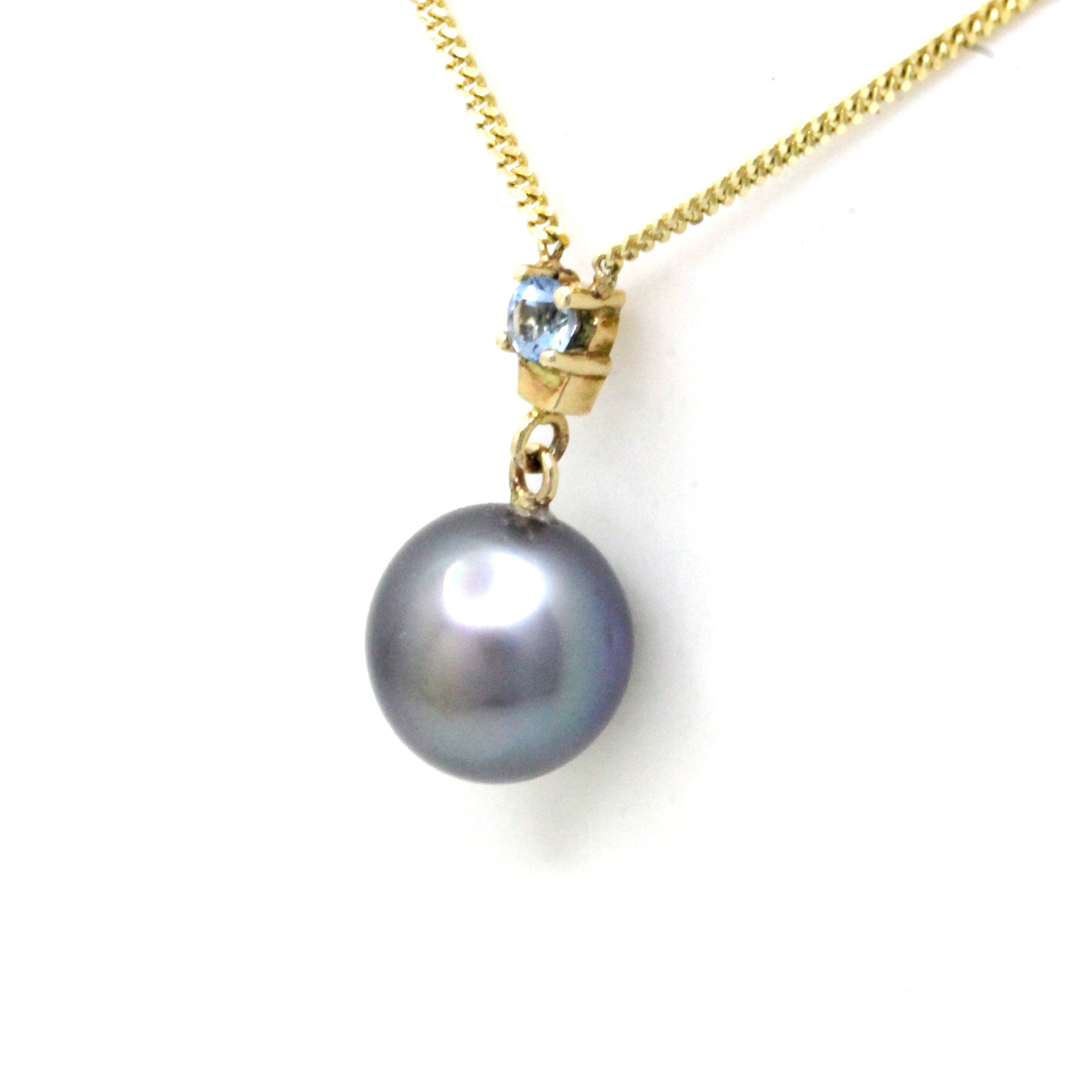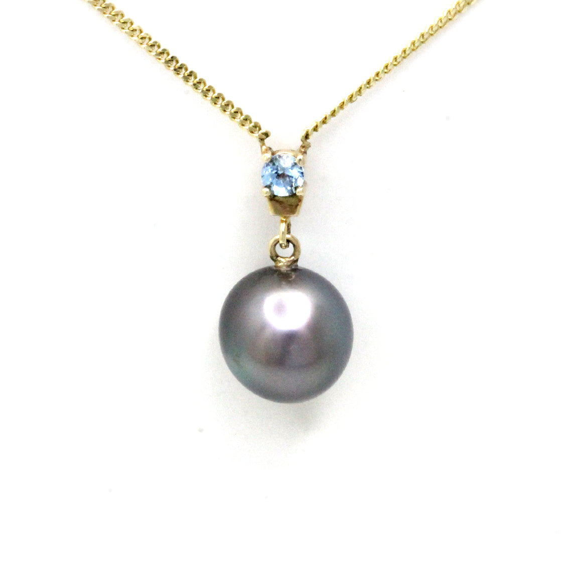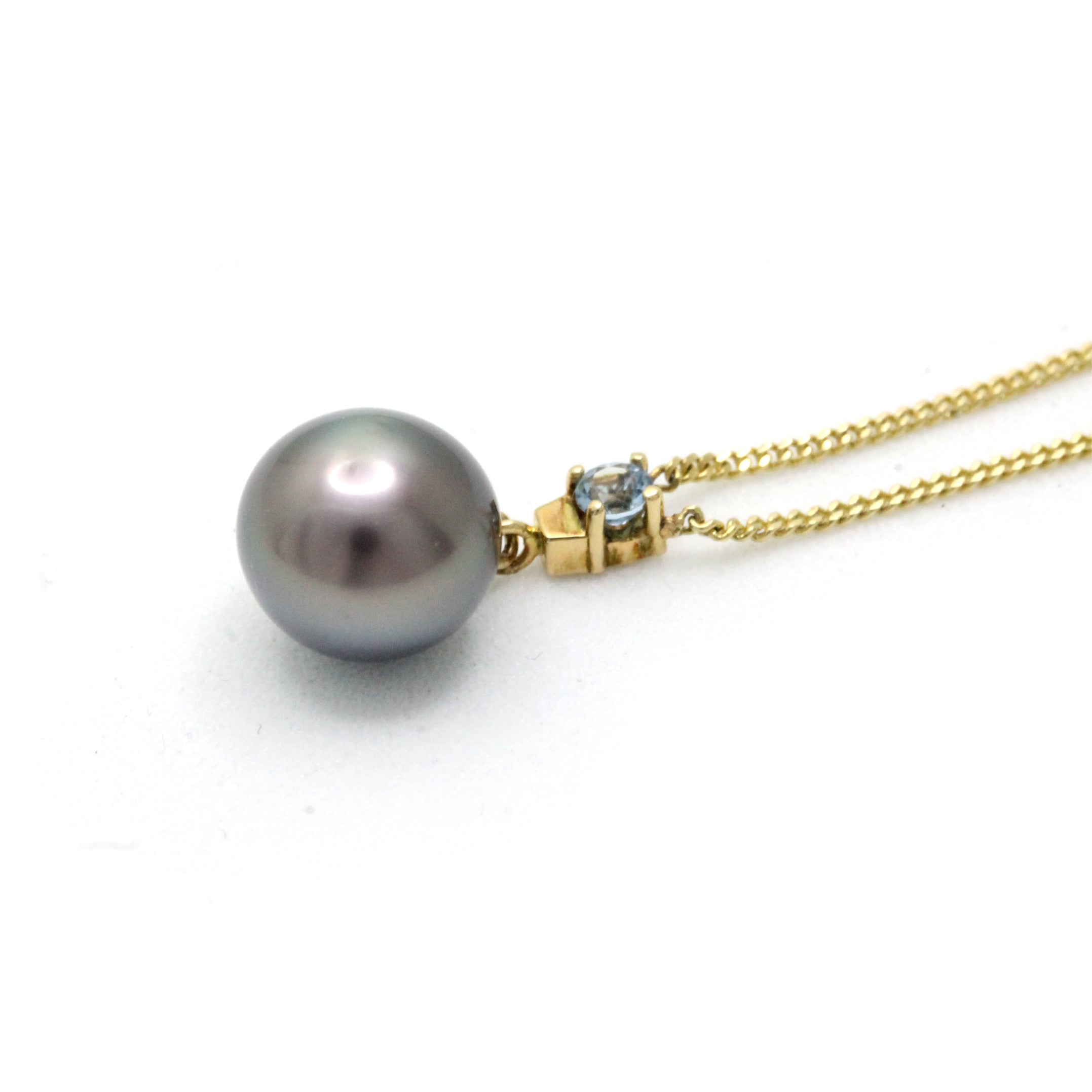 Este dije es protagonizado por una Perla del Mar de Cortez de forma muy regular luce bastante esférica, tiene un gran luste metálico y lo mejor, tiene un color muy interesante. En ella, se podrán encontrar tonalidades muy oscuras, creando un contraste único con el dorado del metal. Característica única e irrepetible, que aunado con la aquamarina, crean una combinación perfecta.