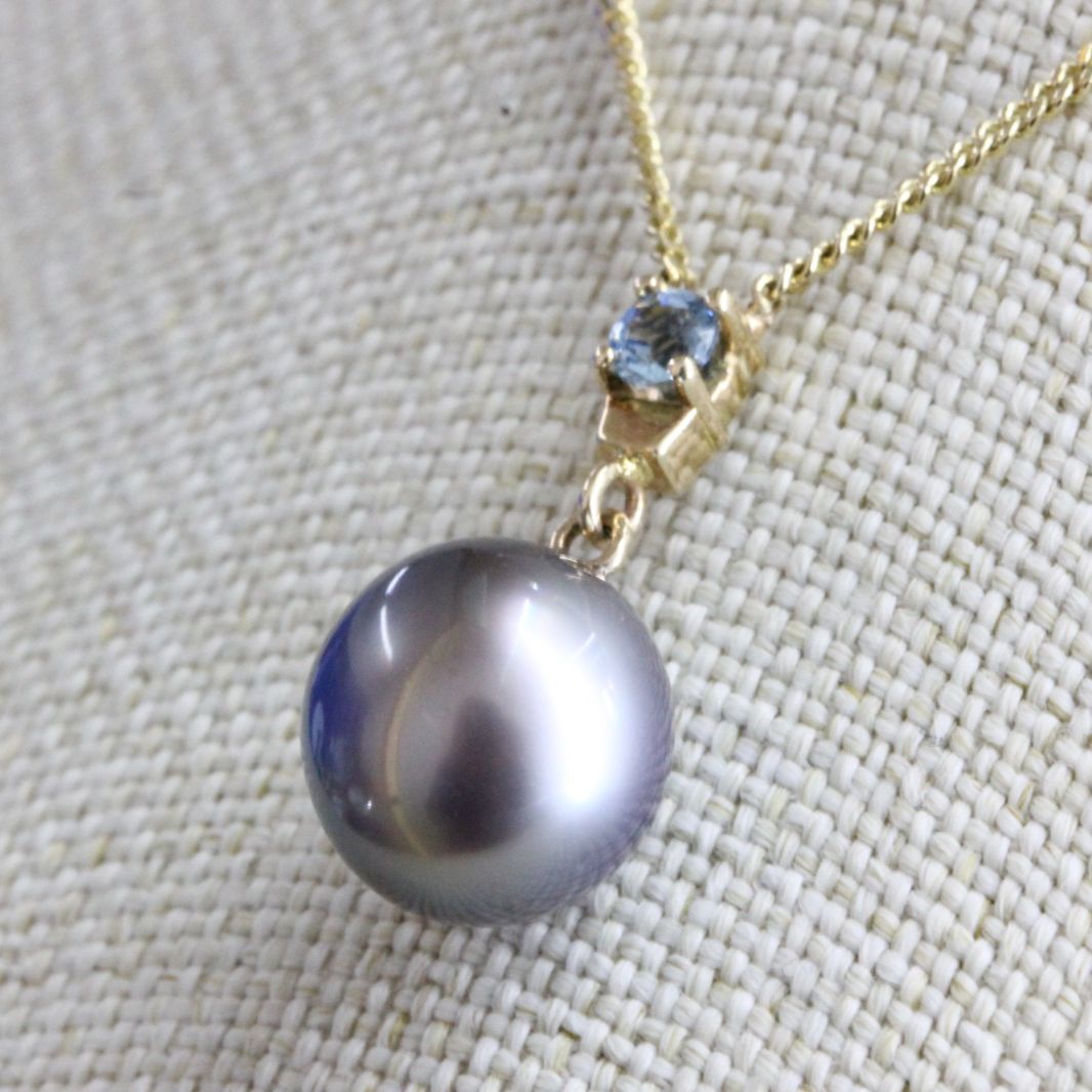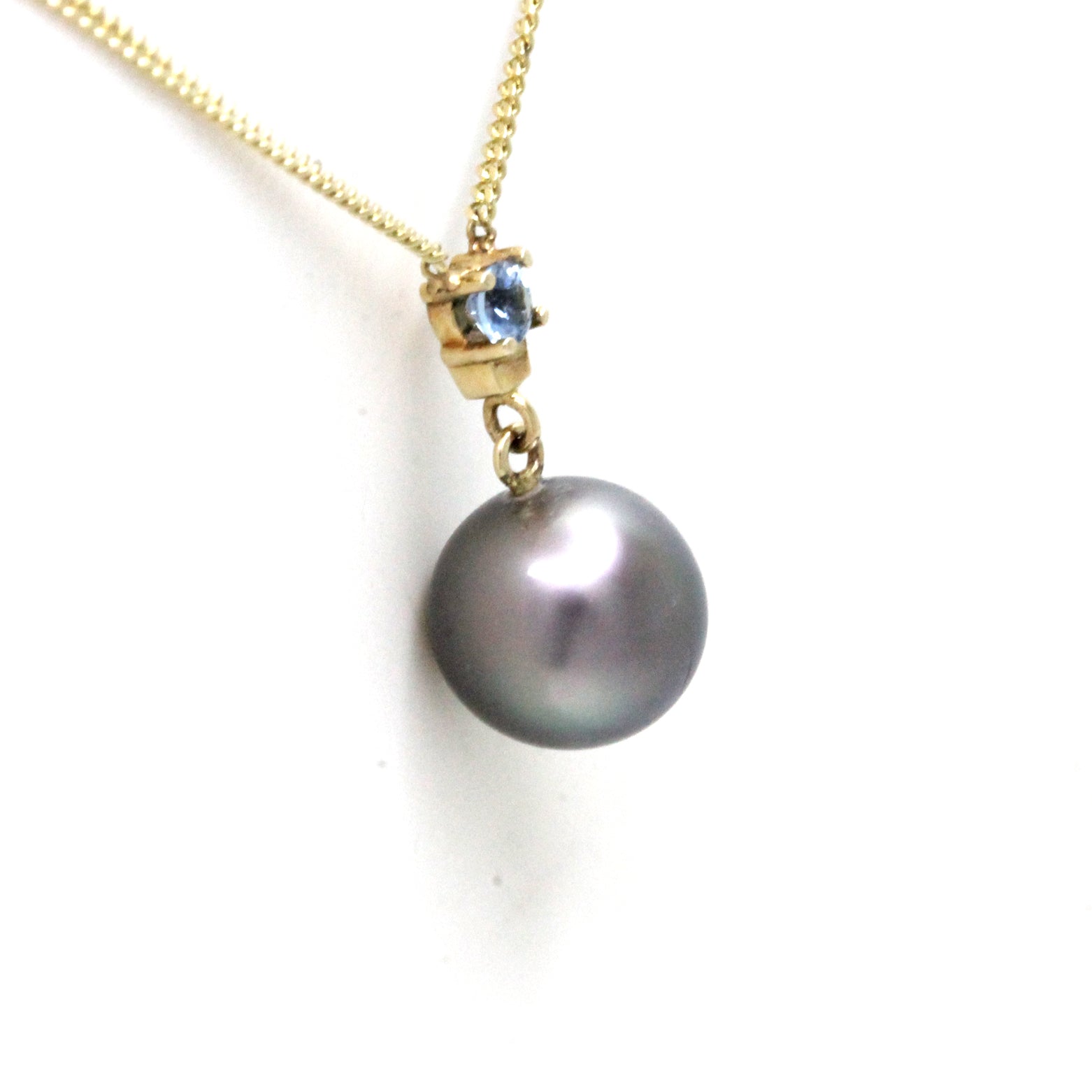 The pearl on it have a very regular shape, the luster is also impressive, but the colors are the best: nice dark overtones such as purple and blue overtones, even warm yellow sparkles, making a unique contrast with the golden metal. In addition, the blue aquamarine make the perfect match. Unique and unrepeatable feature.