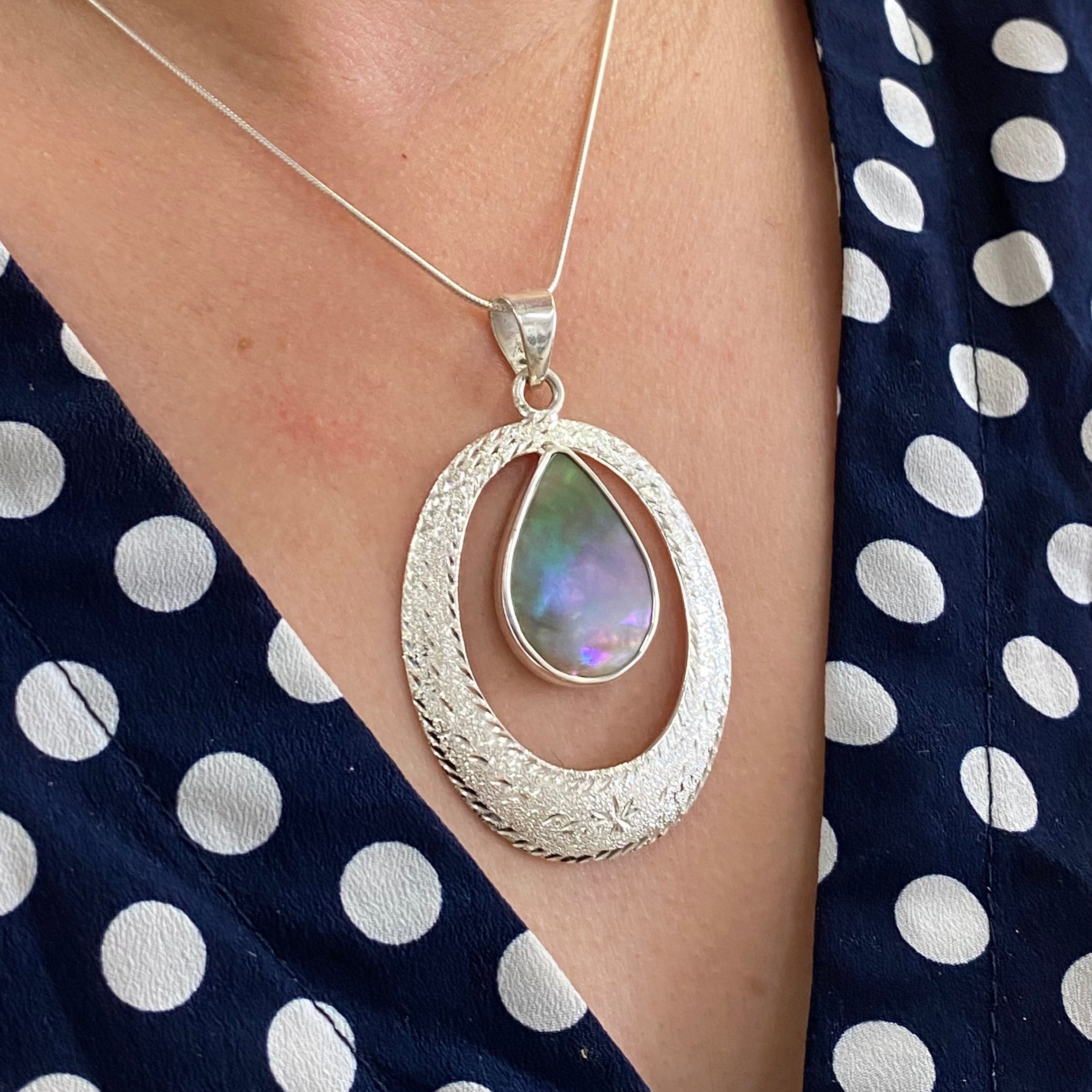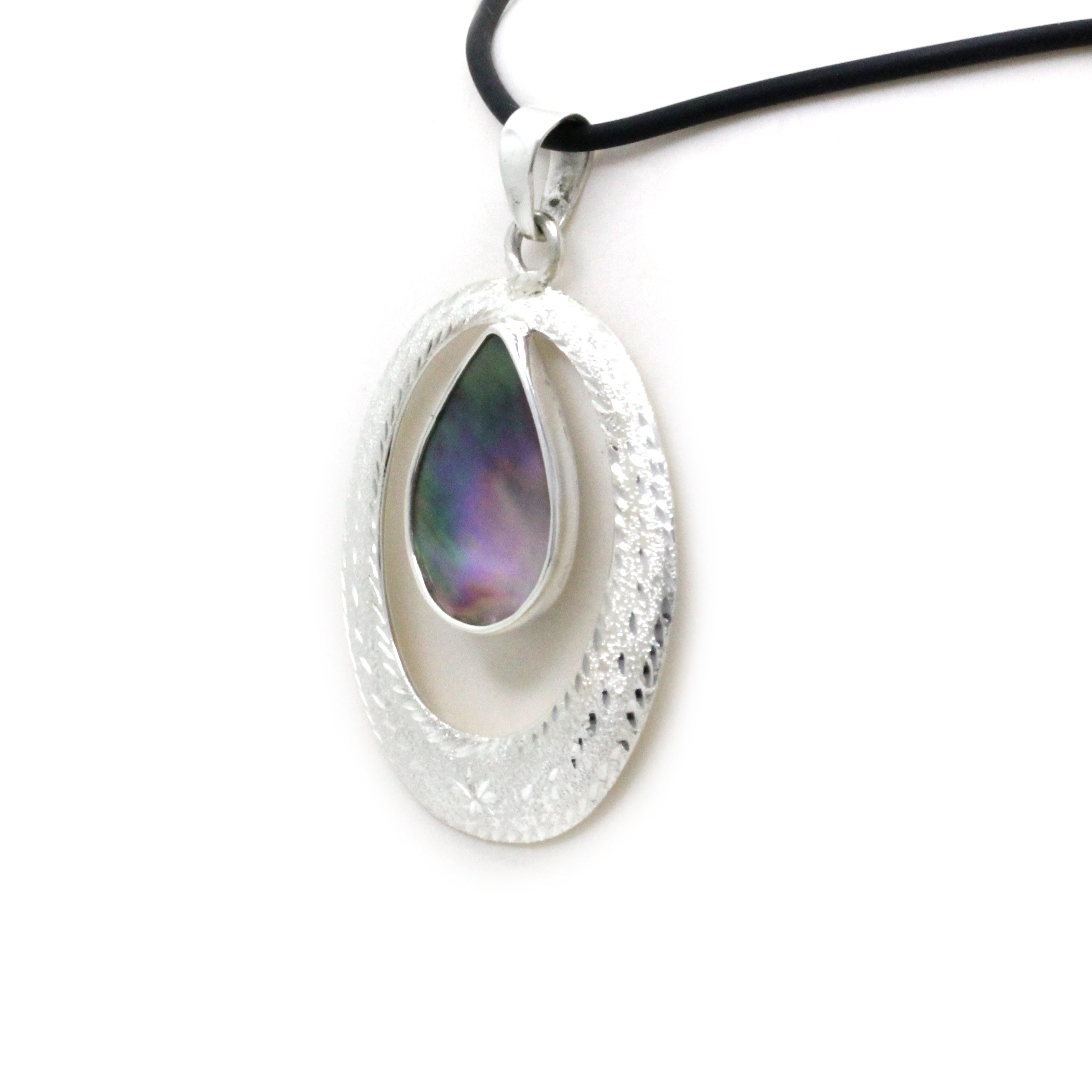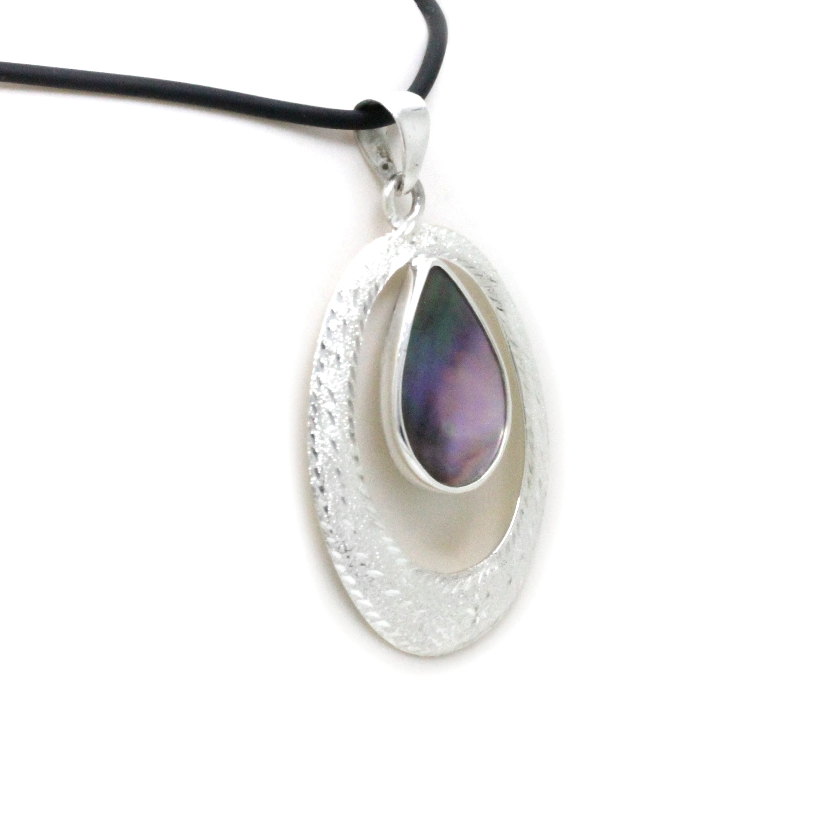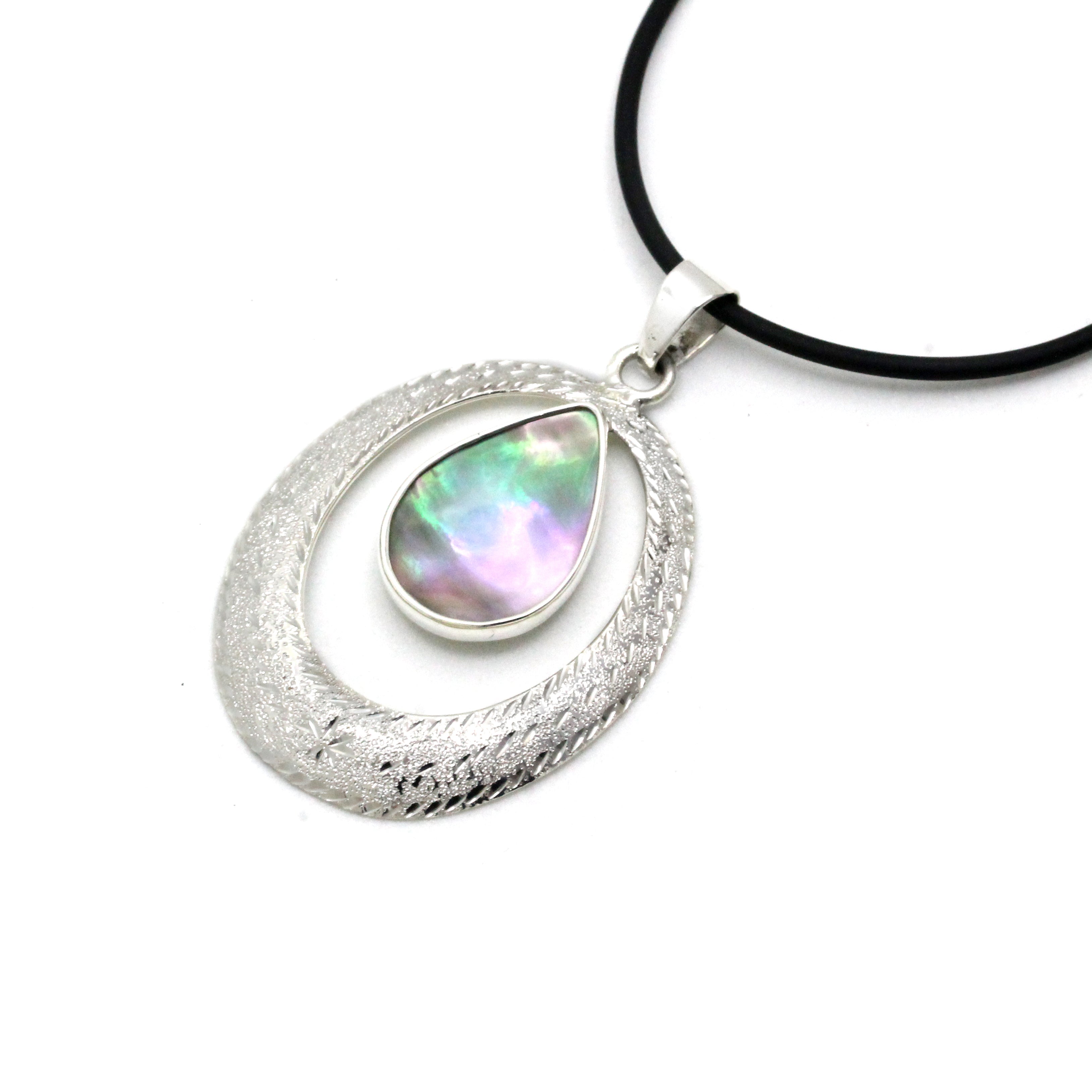 "Circle" is our new and original pendant design with textures and lustrous finishes, crafted in 0.925 silver; its shape surrounds and enhances the piece of shell it holds, a teardrop cut that displays beautiful and intense iridescent colors, hues that vary depending on how the light hits the surface.