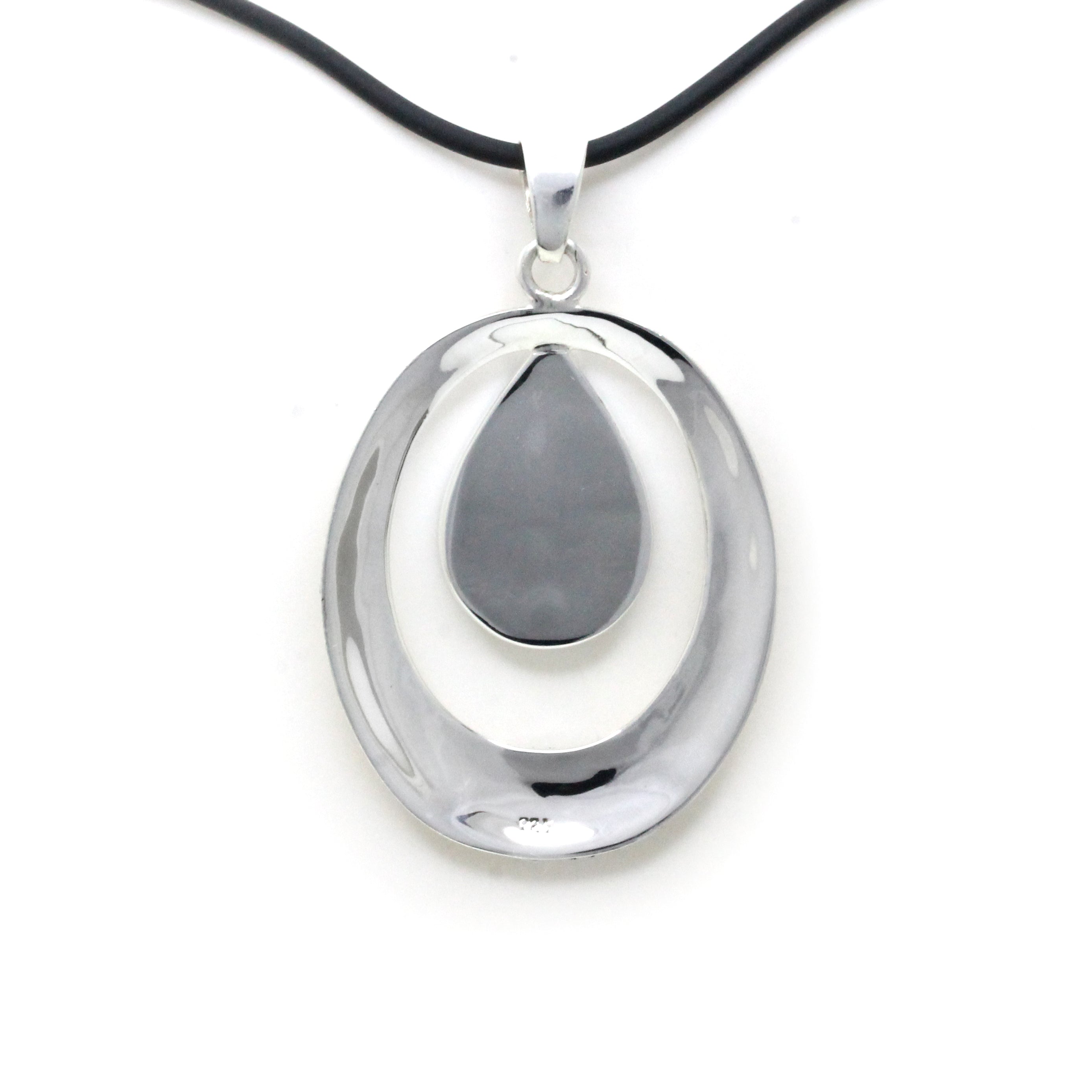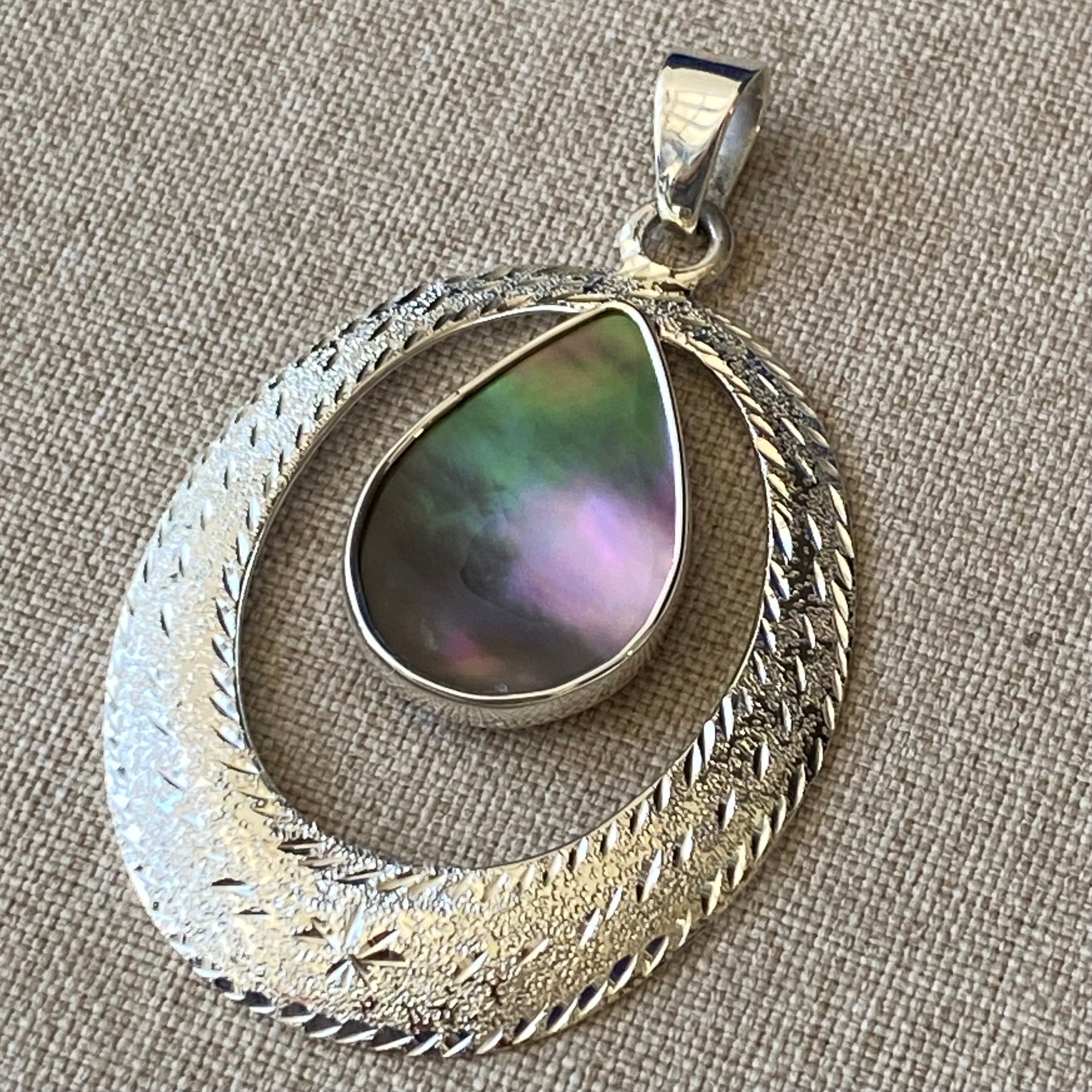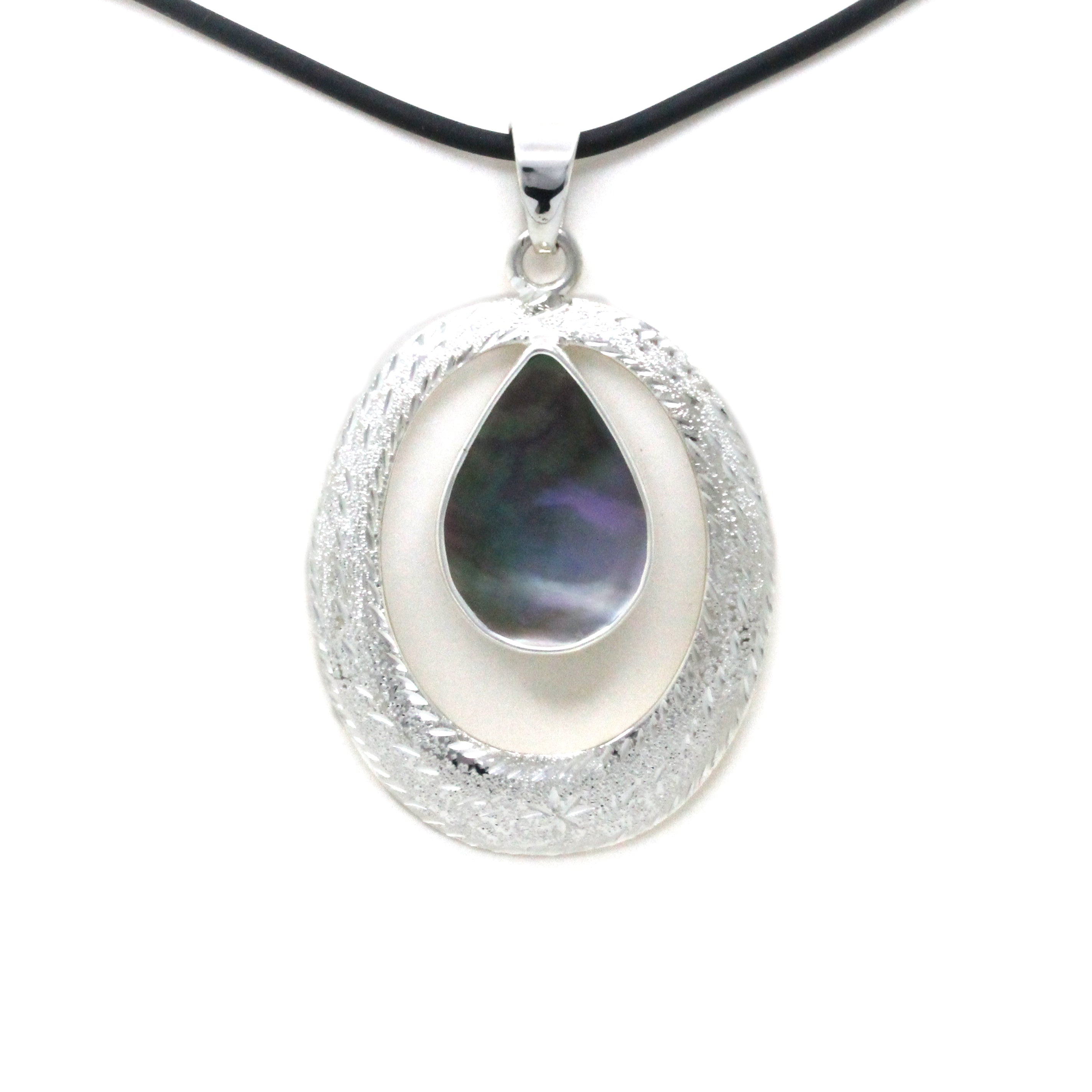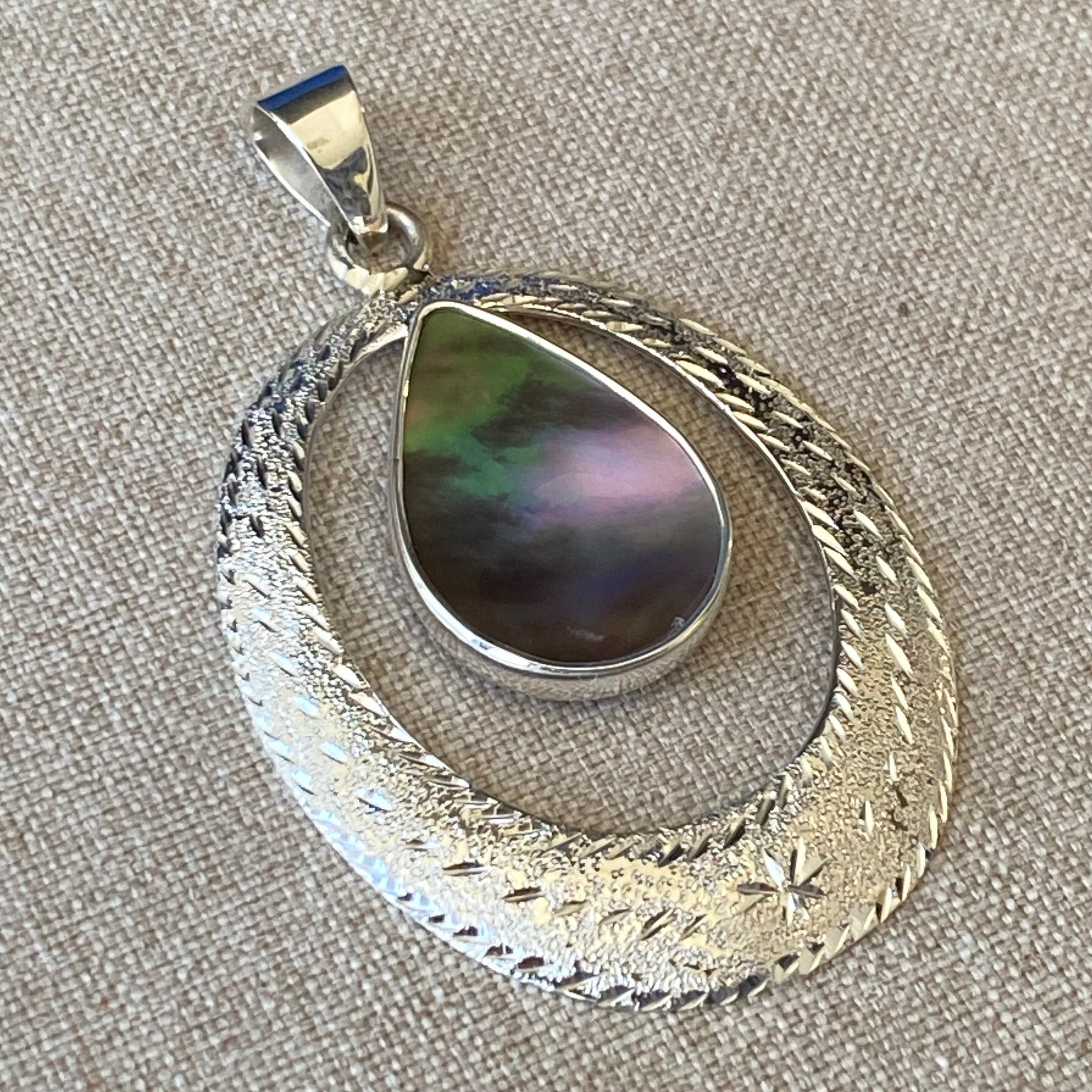 "Circle" is our new and original pendant design with textures and lustrous finishes, crafted in 0.925 silver; its shape surrounds and enhances the piece of shell it holds, a teardrop cut that displays beautiful and intense iridescent colors, hues that vary depending on how the light hits the surface.