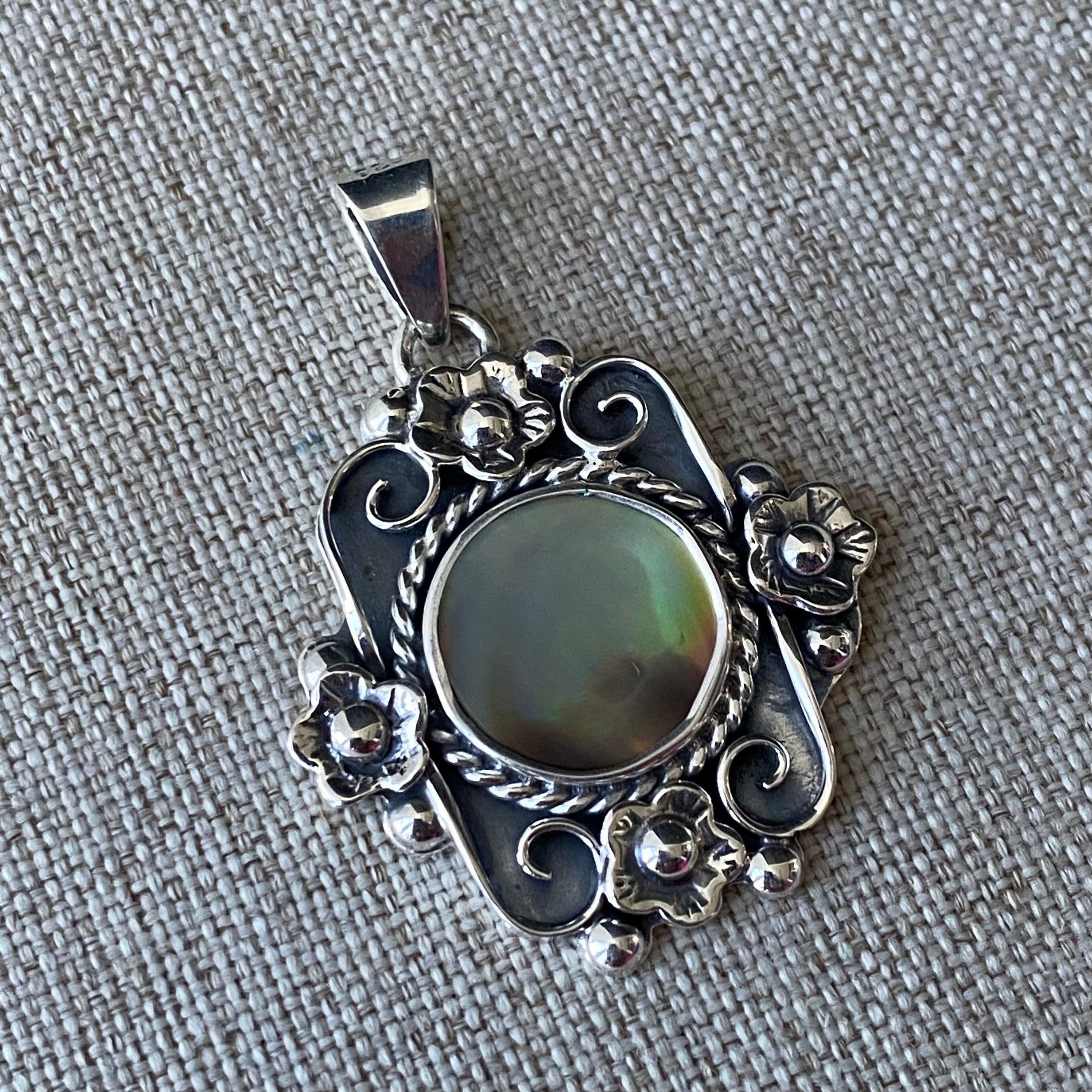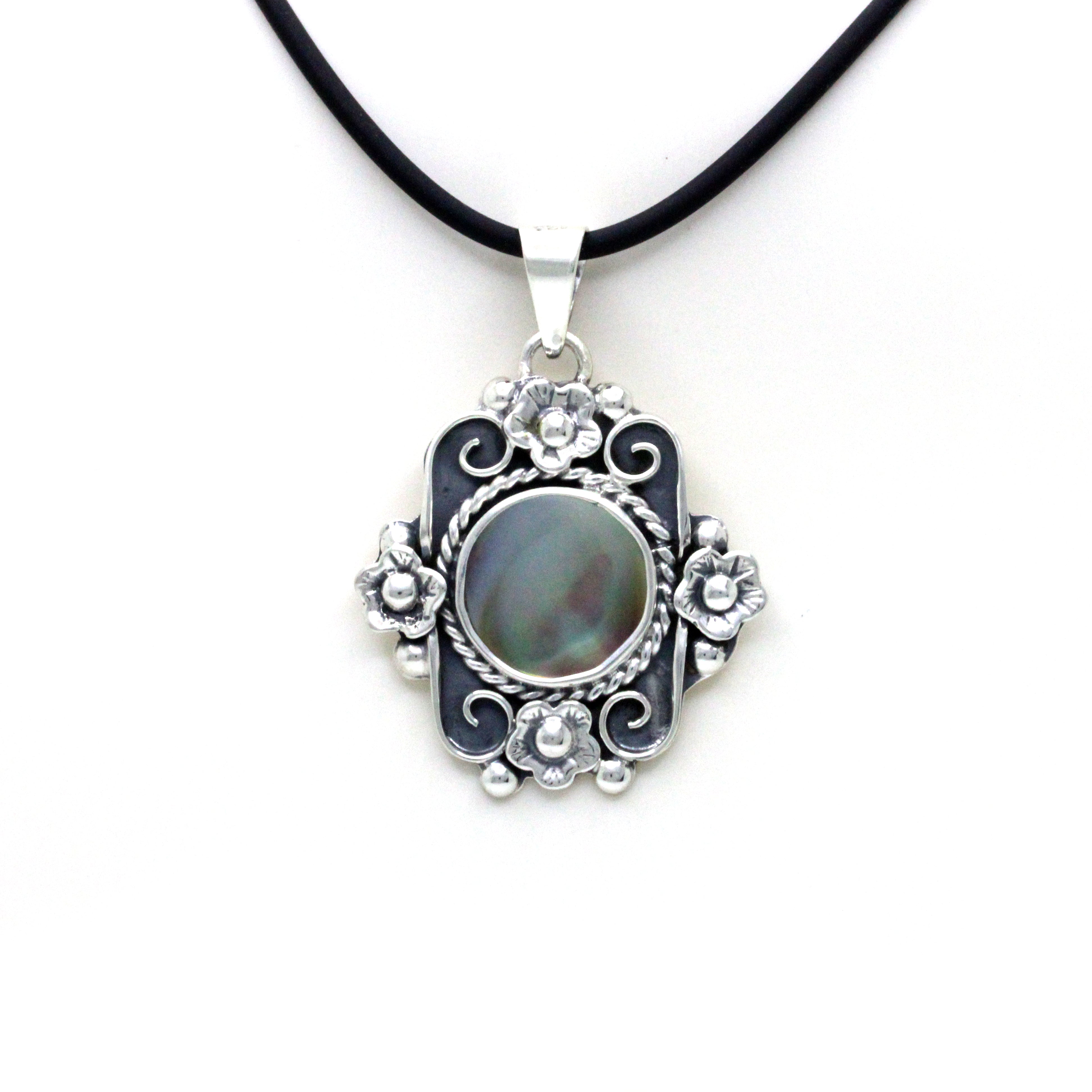 New and original pendant design with textures and dark finishes, crafted in 0.925 silver; its shape surrounds and enhances the piece of shell it holds, a round cut that displays beautiful and iridescent colors, hues that vary depending on how the light hits the surface.